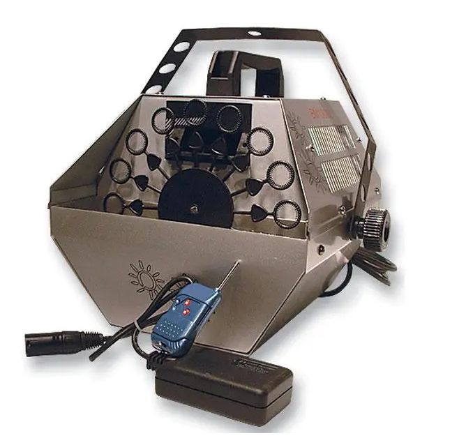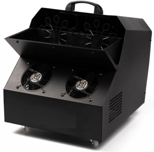 Это приспособление позволяет создать поток мыльных пузырей и великолепно подойдет для использования на различных концертах, вечеринках или любых других мероприятиях. Он оборудован двумя соплами, за счет чего он производит больше пузырей одновременно, и двумя вентиляторами, которые позволяют пузырям лететь на большее расстояние вперед. В генераторе предусмотрен резервуара объемом 2.5 литра для жидкости, а в задней части устройства есть кран для быстрого слива. Управлять генератором можно пультом дистанционного управления или по протоколу DMX. На задней стороне предусмотрен вход и выход XLR (3-pin). Вес генератора составляет 10.5 кг, а для комфортной транспортировки в нижней части предусмотрены колеса.